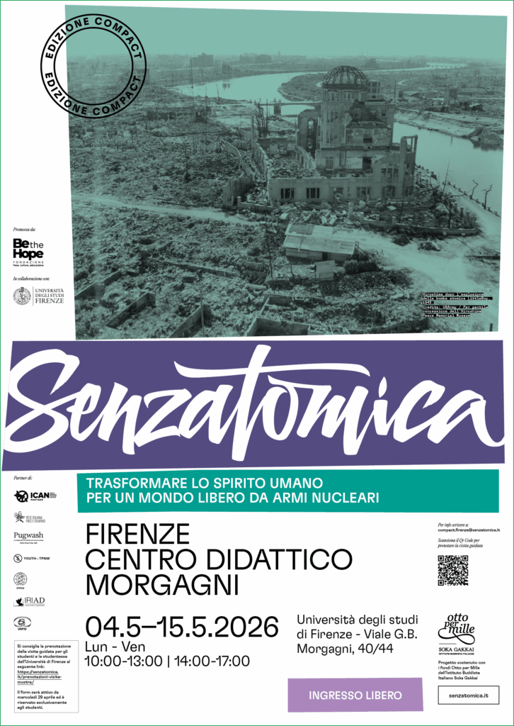 I pannelli della mostra “Senzatomica. Trasformare lo spirito umano per un mondo libero da armi nucleari” saranno esposti presso l’atrio del centro didattico universitario in viale G.B. Morgagni 40/44 dal 4 al 15 maggio compresi, dando modo agli studenti di diventare protagonisti del cambiamento in prima persona!